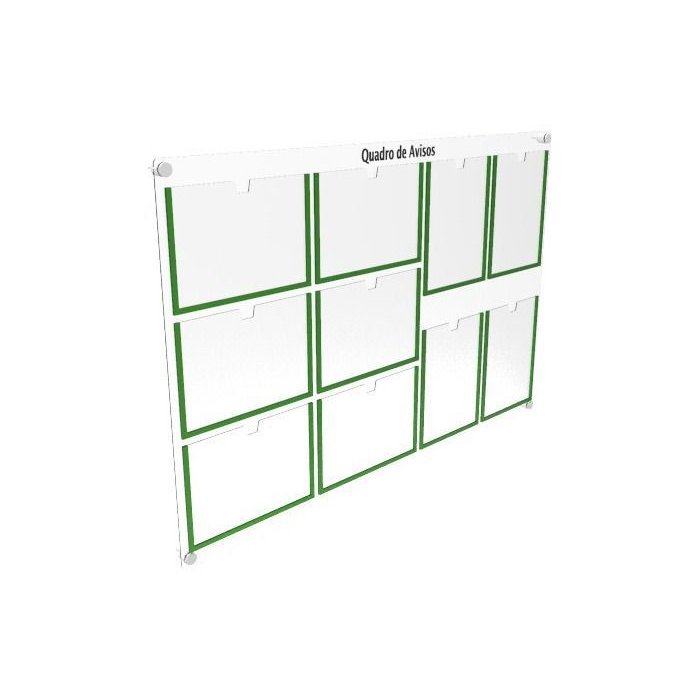 Quadro de avisos é uma excelente escolha para informar e expor avisos de forma prática. Fabricado em Acrílico Cristal e com porta folhas também em acrílico, o quadro de avisos permite que sejam trocados os informativos sem a necessidade de fitas, imãs ou percevejos, pois basta encaixá-los nos porta-folhas, mantendo a beleza da peça e deixando o ambiente de trabalho ainda mais profissional.
