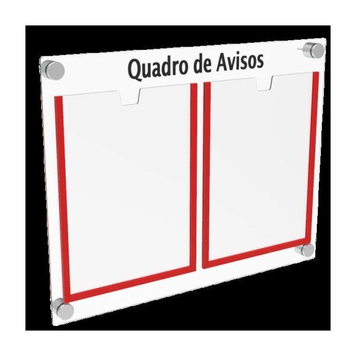 Quadro de avisos é uma excelente escolha para informar e expor avisos de forma prática. Fabricado em Acrílico Cristal e com porta folhas também em acrílico, o quadro de avisos permite que sejam trocados os informativos sem a necessidade de fitas, imãs ou percevejos, pois basta encaixá-los nos porta-folhas, mantendo a beleza da peça e deixando o ambiente de trabalho ainda mais profissional.