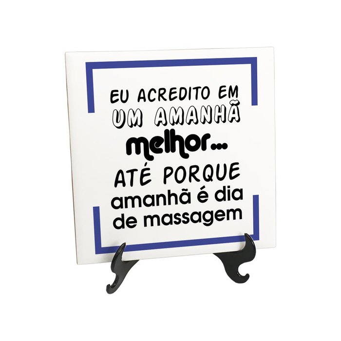 Quadro de Azulejo Engraçada Massagista Frase Presente Dê um toque divertido na decoração da sua casa com o Quadro Azulejo Quadro de Azulejo Engraçada Massagista Frase Presente. O azulejo decorativo de mesa conta com acabamento brilhante. Como utilizamos matéria prima importada, as cores e os detalhes são mais brilhantes, vivos e bem definidos. Pode comprar com tranquilidade pois nunca irá desbotar. Antes que fique a dúvida, sim, já acompanha o suporte que está na foto para que o quadro fique em pé. Só faltava não acompanhar, né Além de ser uma peça decorativa criativa, diferente e que combina tanto com ambientes profissionais quanto caseiros, é um presente inesquecível. Não tem como errar na escolha: com 15 cm de altura x 15 cm de largura x 0,5 cm de espessura, não é exageradamente grande nem pequeno, simplesmente ideal. Cerâmica ou porcelana, você sabe qual é mais resistente e durável - A cerâmica costuma ser mais pesada e ter maior porosidade que a porcelana, apresentando maior resistência e durabilidade. A cerâmica é amplamente utilizada nos mais diversos objetos decorativos. Ficha Técnica Marca: For My Job Modelo: Engraçada Massagista Frase Presente Material: Cerâmica com acabamento brilhante Acompanha suporte: Sim Tamanho (A x L): 15cm x 15cm Espessura: 0,5cm Limpeza: Somente com pano úmido Cuidados: Não utilizar produtos químicos ou abrasivos Conteúdo Da Embalagem: 1x Quadro de Azulejo Engraçada Massagista Frase Presente1x Suporte de mesa para azulejo decorativo IMPORTANTE: seguimos todos os procedimentos técnicos para garantir a reprodução das cores conforme nas imagens, porém é normal que os produtos apresentem variações nas tonalidades por conta das diferenças das telas dos monitores ou celulares nos quais eles estão sendo visualizados. Vale dizer, as cores que você está vendo podem ficar mais claras ou escuras em relação ao produto real por conta da tela em que estão sendo exibidos. Trata-se de um fenômeno comum a todos os produtos da categoria, mas nada para se preocupar :)