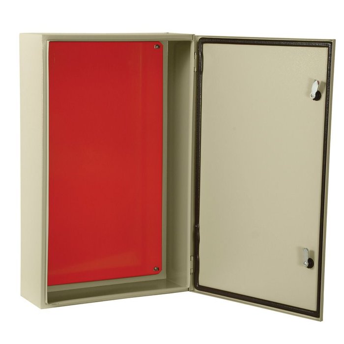 Em chapa de aço tratada a base de fosfato de ferro e pintura a pó. Caixa e porta na cor bege RAL 7032. Placa de montagem na cor laranja RAL 2004.