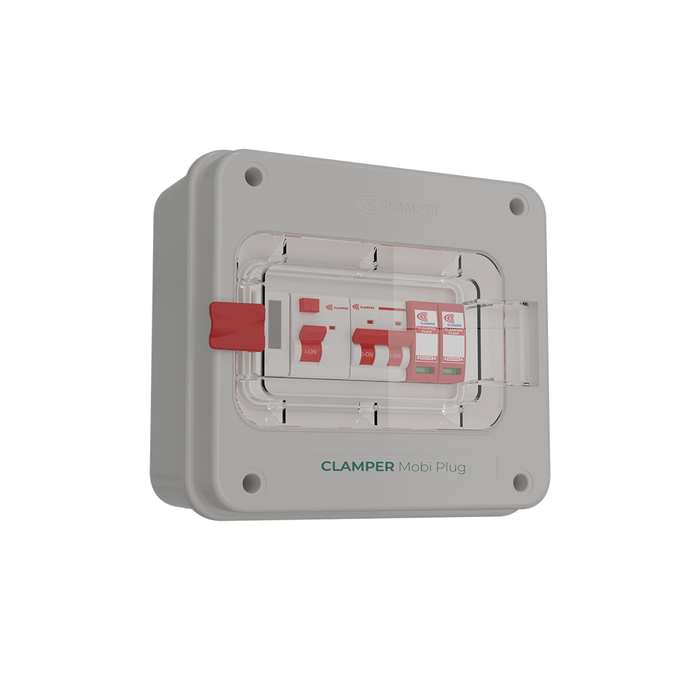 O CLAMPER Mobi Plug 220V 5KW C R M com Medidor de Consumo é a solução de proteção para carregadores de veículos elétricos com Dispositivo de Proteção contra Surtos (DPS) CLAMPER Front, Interruptor Diferencial Residual (IDR), medidor e disjuntor.