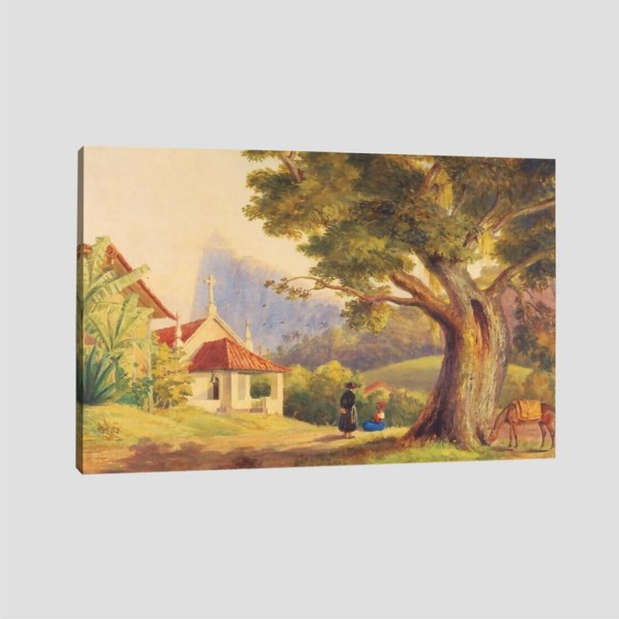 Quadro Reprodução Pintores Debret Atrás do Corcovado Tela Canvas Chassi Interno 63x42cm. Reprodução de pintura famosa do artista Jean Debret. Acabamento Chassi Interno. Tamanho: 63x42cm. Material: Tela Canvas. Referência: QCD5311X85e1X29h0X246. Dispensa vidro. . Quadro com imagem impressa em tecido canvas (o mesmo usado em tela de pintura) esticado em chassi de madeira tratada com 3 cm espessura. As laterais do quadro são cobertas com a extensão da imagem frontal (sem alterar a imagem original da frente do quadro) O quadro tela canvas vai pronto pra colocar na parede e dispensa uso de vidro.