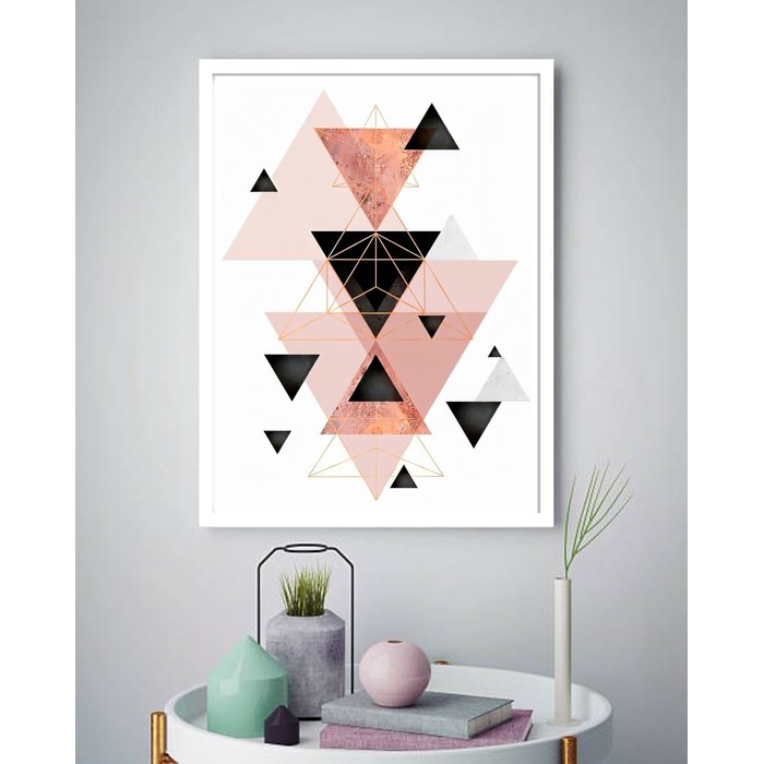 Quadro Decorativo Abstrato Triângulos Pirâmides Rosê-70x50cm:moldura Preta Moldura Preta