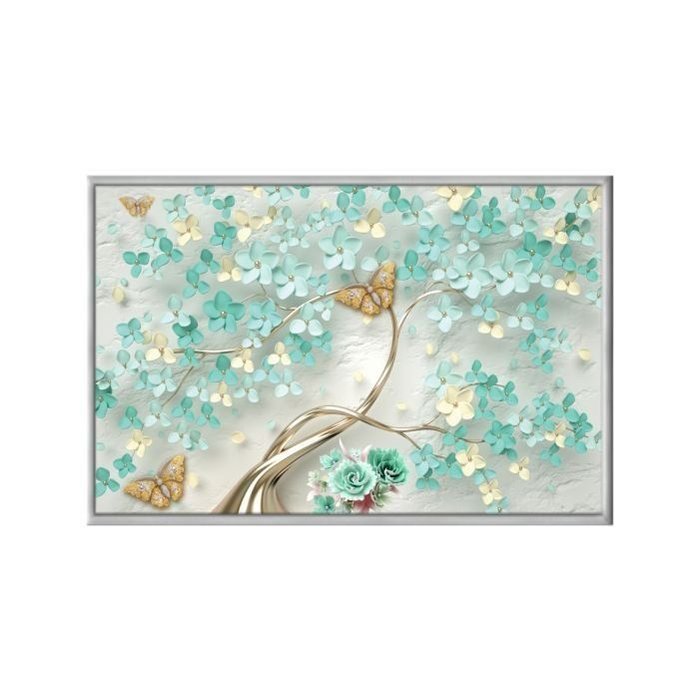 Quadro Decorativo - Arvore Floral Dourado Turquesa Borboleta Art041 - Tela Canvas - 60x40cm