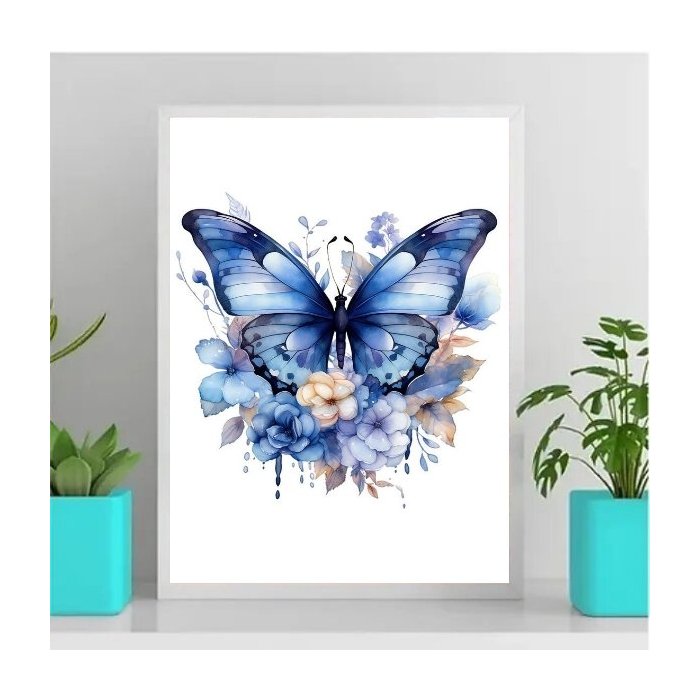 Quadro Decorativo Borboleta Azul Aquarela 33x24cm:Madeira branca