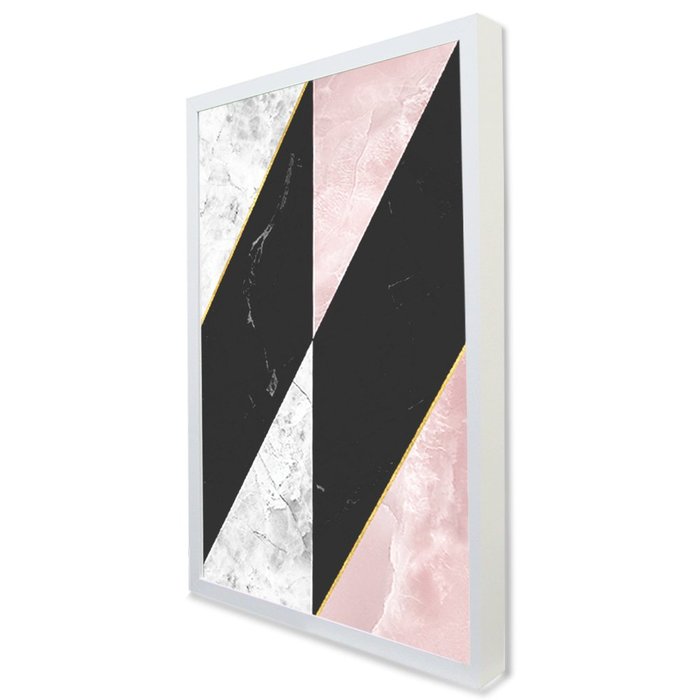 Quadro Decorativo Caixa Alta com Vidro Geométrico Mármore Rosa e Preto TaColado Moldura Branca 120 x Branca