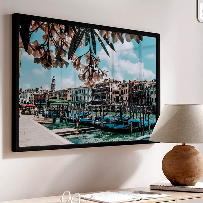 Quadro Decorativo Caixa Alta com Vidro Cidade de Veneza - As Gôngolas e as Flores