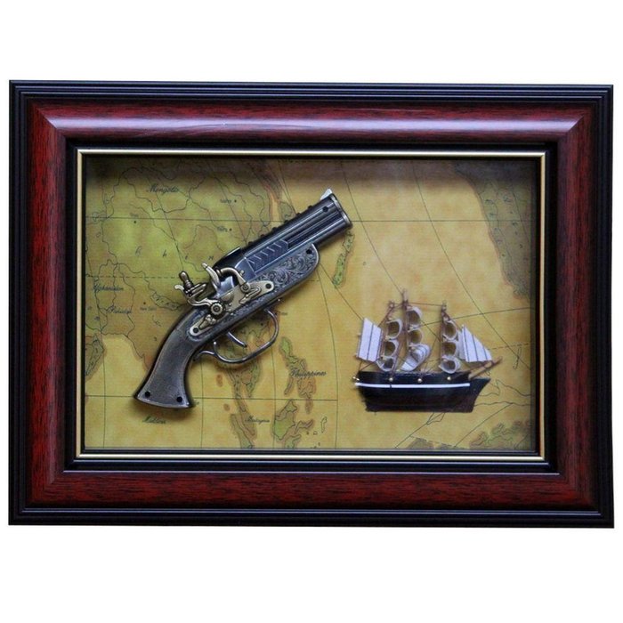 Com suas características próprias e design rústico este produto deixará um charme a mais na decoração, sendo de fácil manuseio para a utilização em vários ambientes que dão um toque especial para quem gosta de arte e armas. Fundo do quadro com mapa Mundi de coloração Vintage, Moldura de Madeira Mdf, com tampo de vidro.