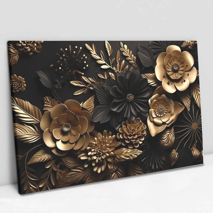 Quadro Decorativo Floral Luxo em tela Canvas Flores Preto e Dourado
