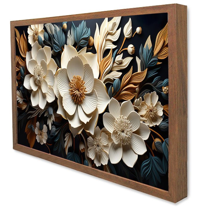 Quadro Decorativo Floral Luxo Flores Tons de Ouro e Azul em Moldura Caixa Tacolado Moldura Caixa 3cm