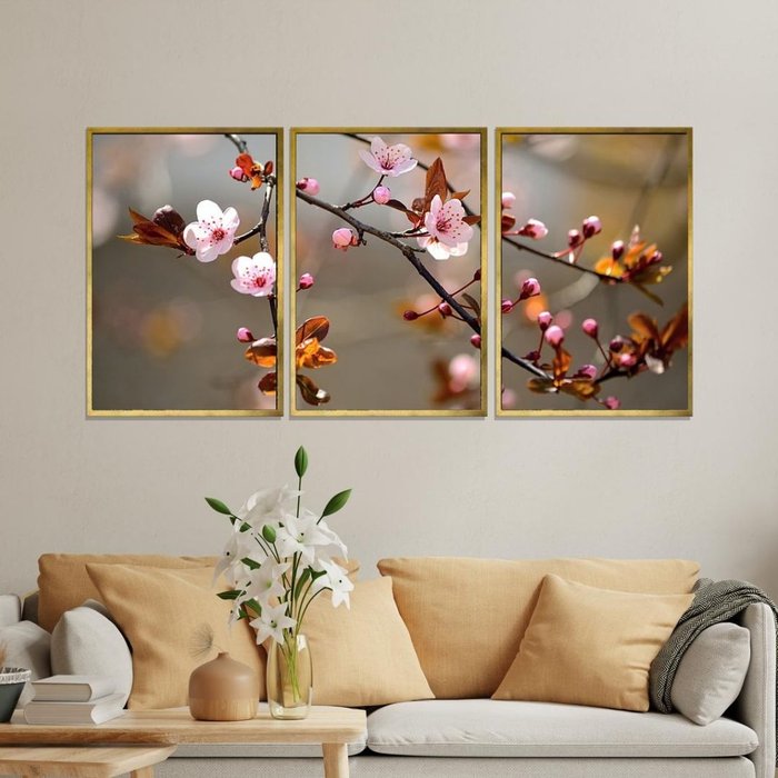 Quadro Decorativo - Flores de Cerejeira - 3 Telas - Moldura Dourada - 120x60cm