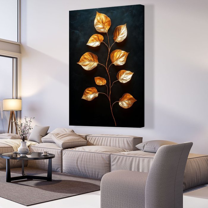Quadro Decorativo Folhas Douradas Fundo Black Sala Quarto Casa Escritório Chassi Borda Infinita