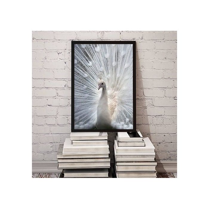 Quadro Decorativo Fotografia Pavão Branco 33x24cm - com Vidro:madeira Branca