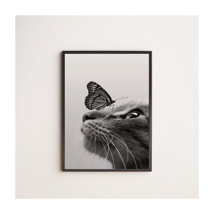 Quadro Decorativo Gato Com Borboleta 45x34cm - com vidro:Madeira branca branca
