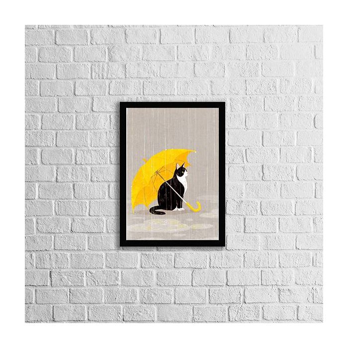 Quadro Decorativo Gato com Sombrinha Amarela 45x34cm - com vidro:Madeira preta