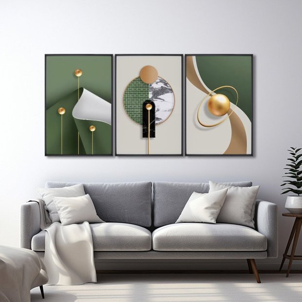 Quadro Decorativo Geométrico Formas Abstratas com 3 Telas de Parede para Sala Quarto Escritório 60cm Sem Vidro Preto