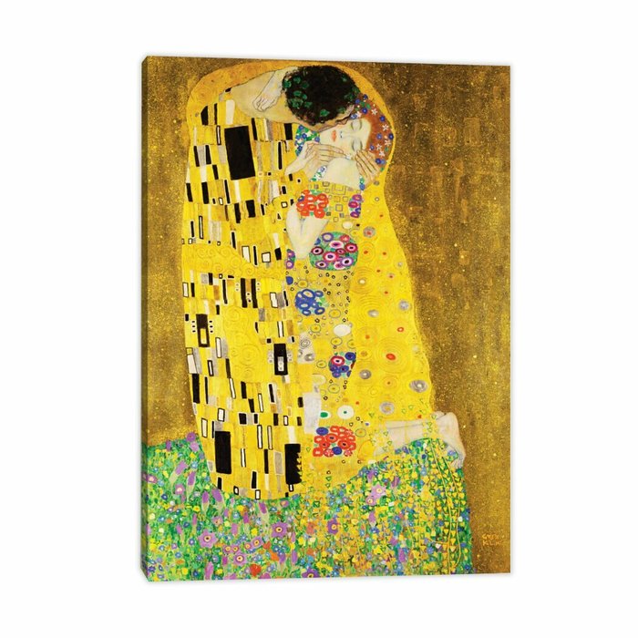 Quadro Reprodução Pintores Klimt O Beijo Tela Canvas Chassi Interno 120x80cm. Reprodução de pintura famosa do artista Klimt. Acabamento Chassi Interno. Tamanho: 120x80cm. Material: Tela Canvas. Referência: QCAFK600X18T2X87a2X980. Dispensa vidro. . Quadro com imagem impressa em tecido canvas (o mesmo usado em tela de pintura) esticado em chassi de madeira tratada com 3 cm espessura. As laterais do quadro são cobertas com a extensão da imagem frontal (sem alterar a imagem original da frente do quadro) O quadro tela canvas vai pronto pra colocar na parede e dispensa uso de vidro.