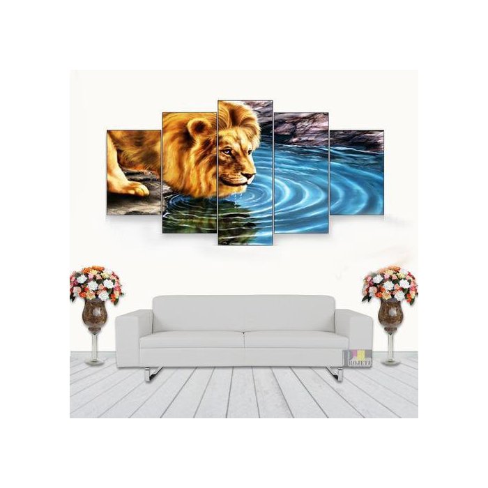 Quadro Decorativo Leão Bebendo Água 115x60 5 Peças 5