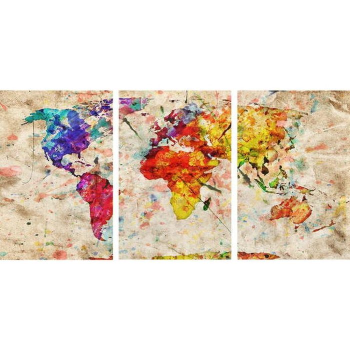 Quadro Decorativo Mapa Mundi Colorido em Papel Envelhecido 3 Telas