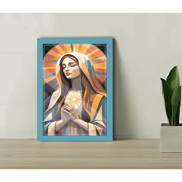 Transforme seu espaço com arte espiritual e moderna! Com vidro protetor e tamanho A4 (33x25 cm), este quadro traz um toque de paz e inspiração ao ambiente. A imagem abstrata de Maria adiciona um toque de beleza e reflexão.