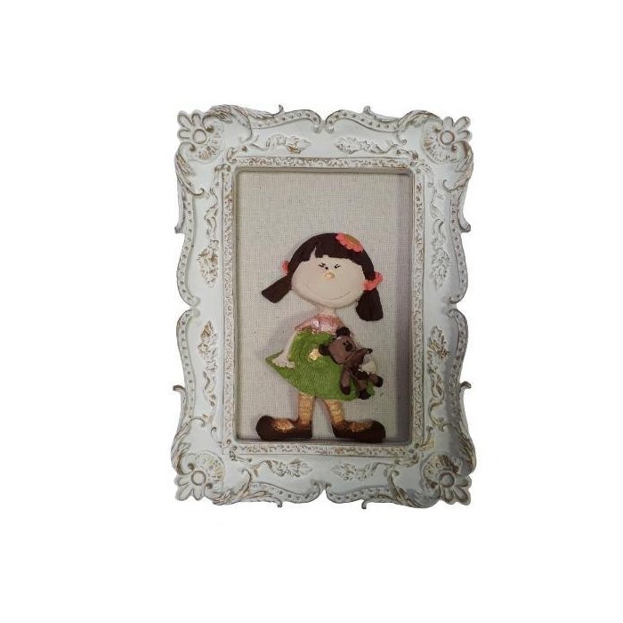 Quadro de 19 x 14,5 cm feito em Moldura de resina e hdf(Eucatex) revestido com tecido de algodão cru, aplique menina mede 11,5cm é de resina pintado em tinta pva colorida..