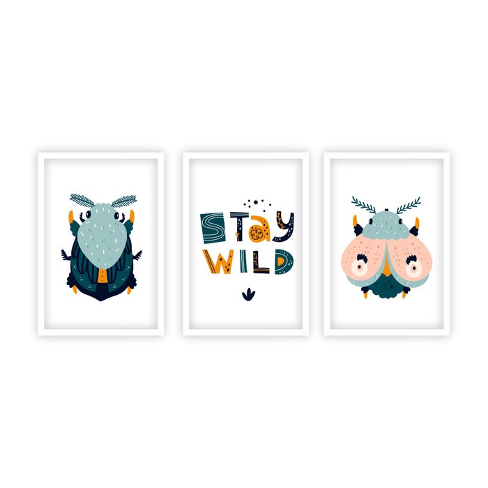 Quadro decorativo minimalista com moldura branca e vidro Insetos Stay wild Infantil