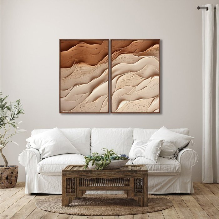 Quadro Decorativo Modelo Areia com 2 telas cm ou cm para Sala, Quarto, Banheiro, Escritório, Hall, Hall de Entrada, Estúdio, Salão, Clínica.Especificações Técnicas:Modelo: Areia;Material da Imagem: Papel premium fotográfico de alta qualidade;Material da Moldura: Madeira de reflorestamento revestida;Espessura da Moldura: 2,7cm de profundidade e 1,5cm frontal;Medidas: cm ou cm;Acabamento: Fita Kraft;Acompanha: Suporte de serrilha para quadros e parafusos.Transforme seu espaço com elegância e sofisticação! Não perca a oportunidade de adquirir o exclusivo Quadro Decorativo Modelo Areia com 2 Telas a um preço incrível!