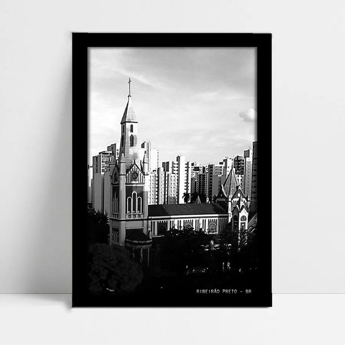 Quadro Decorativo Monumento Cidade Ribeirão Preto em Moldura Caixa Tacolado Moldura Caixa Alta 4,5cm Branca, Preta, Freijó, Madeira, Madeira Escura