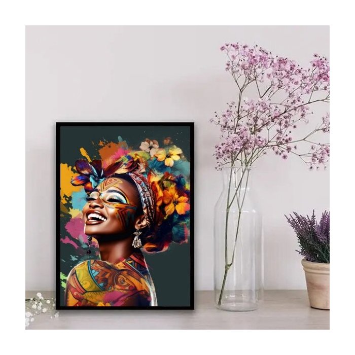Quadro Decorativo Mulher Arte Africana 24x18cm - com vidro:Madeira preta