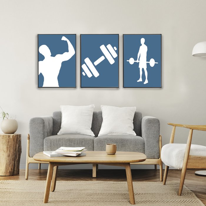 Conjunto de Quadros Decorativos com 3 telas com Moldura Filete - Musculação Minimalista