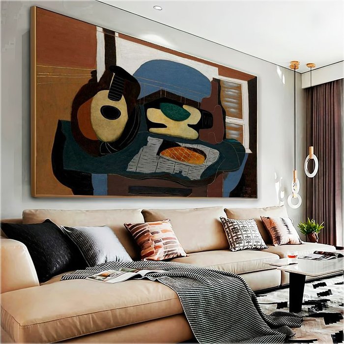 Quadro Decorativo Pablo Picasso Natureza Com Bandolim E Bolo:120x80 cm/PRETA