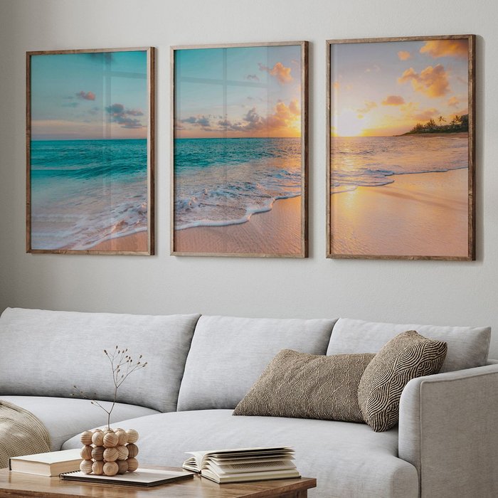 Quadro Decorativo Paisagem Praia, Mar e Pôr do Sol 3 telas 60x90 para Sala Casa de Praia Banheiro Com Vidro Tabaco