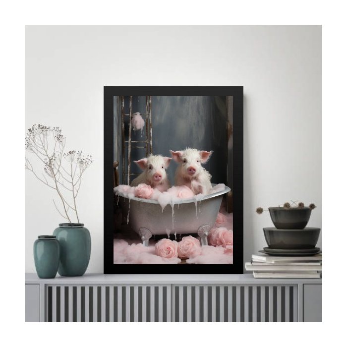 Quadro Decorativo para Banheiro - Porquinhos 45x34cm - com Vidro:moldura Preta