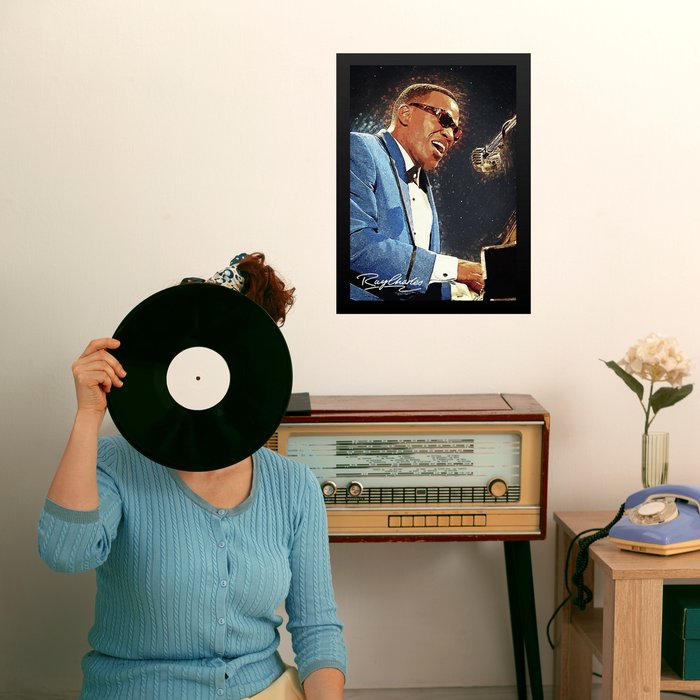 Quadro Decorativo Ray Charles Assinatura 33x24cm - com Vidro:moldura Preta Moldura preta