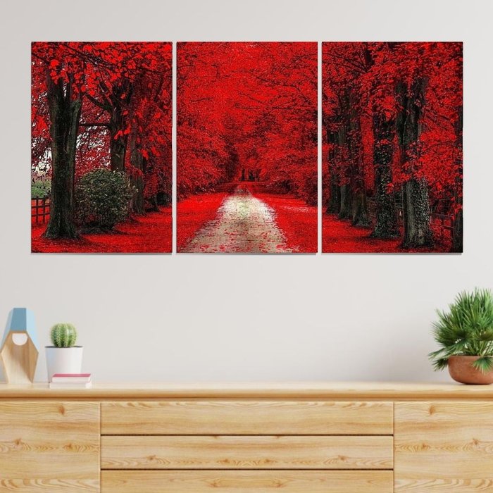 Quadro Decorativo - Três Telas - Caminho com Arvores Vermelhas -120x60cm
