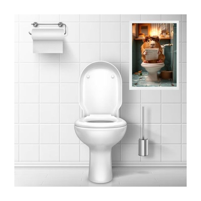 Quadro Divertido Banheiro Hamster Lendo Jornal 24x18cm - com Vidro:moldura Branca Moldura branca
