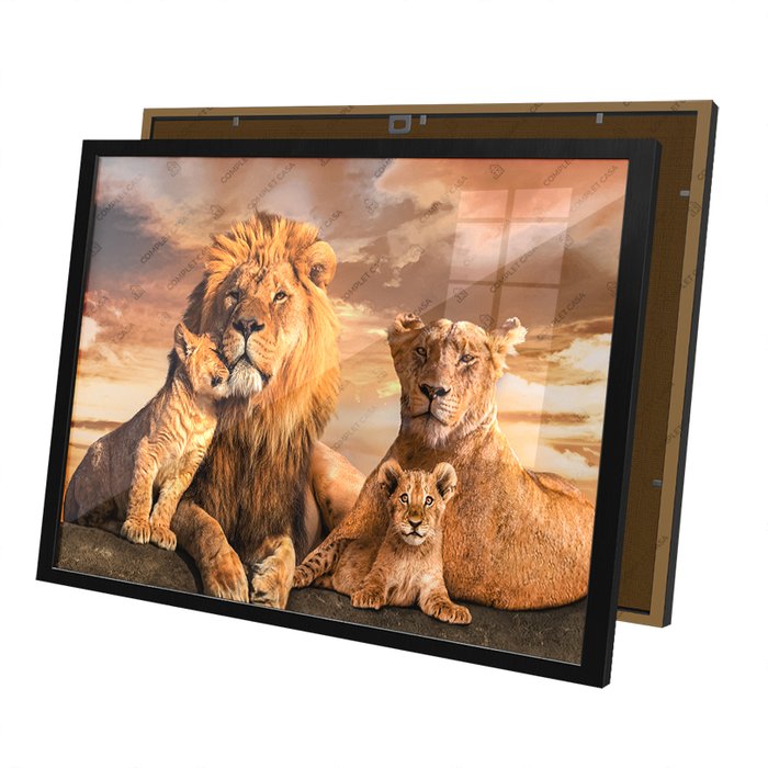 Quadro Família de Leões Savana 2 Filhotes Moldura e Vidro