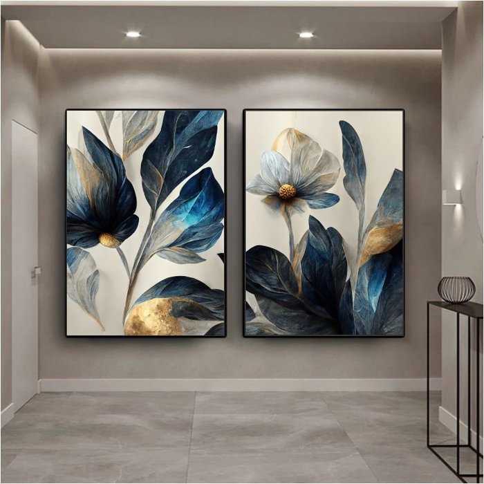 Quadro Flor Azul Branco e Gold - Kit 2 telas