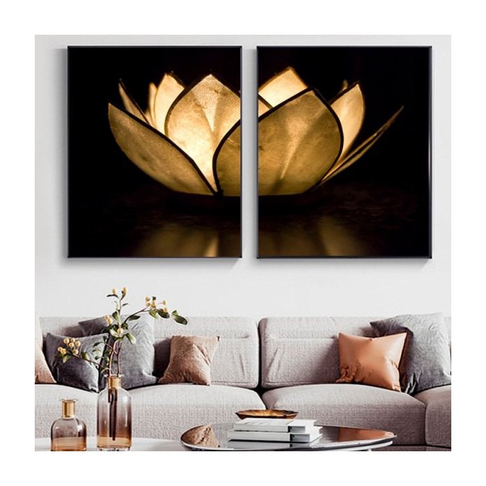 Quadro Flor de Lotus Preto e Dourado Luxo - Kit 2 telas - 60 x 40 cm - Branca