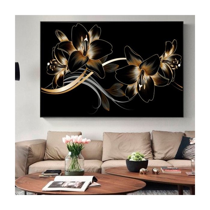 Quadro Flor Lírio Preto e Dourado - Tela Única - 200 x 120 cm - Branca