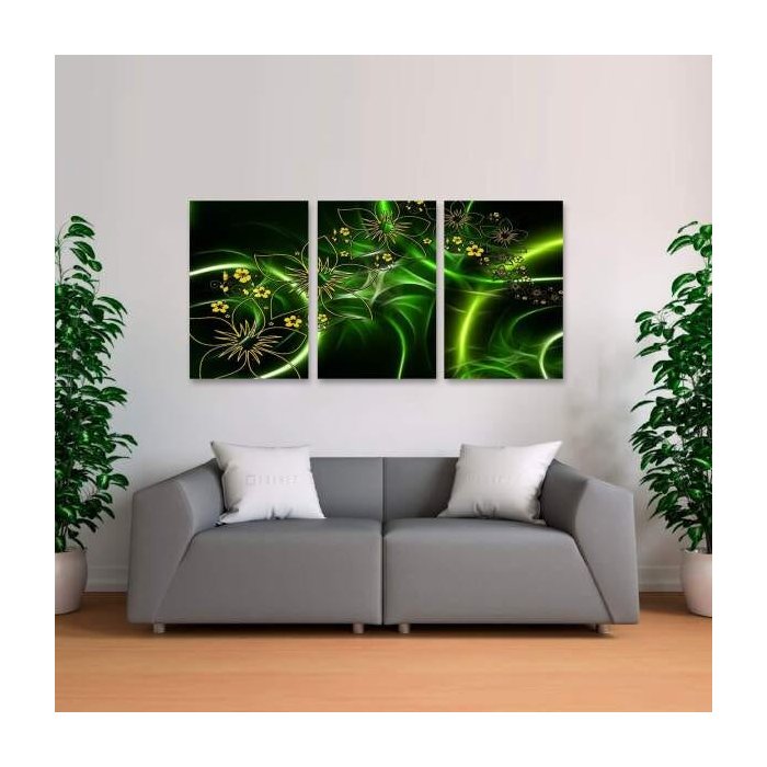 Quadro Flores Verdes Para Sala Quarto Design Digital Conjunto 3 Peças em Tecido