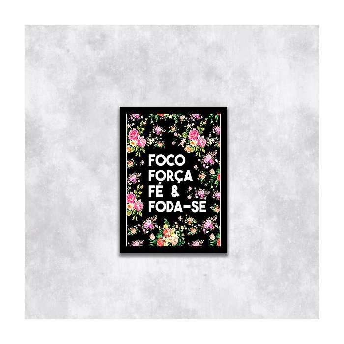 Quadro Foco, Força, Fé e Foda-se 45x34cm - com vidro:Madeira preta