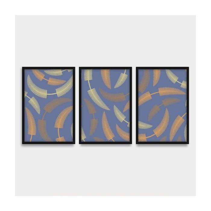 Quadro Folhas Abstratas Kit 3 Peças Com Moldura 60x120 Moldura Preta