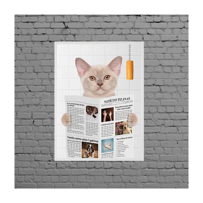 Quadro Gato No Banheiro Com Jornal 45x34cm:Madeira branca