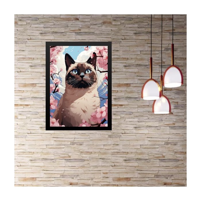 Quadro Gato Siamês Flores Cerejeira 33x24cm:moldura Preta