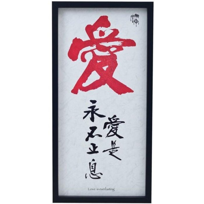 Quadro Decorativo Ideograma Chinês, o amor é eterno (love is everlasting). Material: Moldura de alta qualidade, confeccionada em madeira com perfeito acabamento. Gravura importada texturizada, impressa em papel de alta qualidade. Fundo MDF. Especificações Técnicas: Tamanho Exato do Quadro (LxA): 37x74 cm. Dimensão da Moldura (LxA): 2,5x2,5cm. Peso: 3 Kg. Cor: Preto. Vidro: Não. Referência: DP024. Limpeza: Utilizar pano seco. Garantia: 3 meses contra defeitos de fabricação.