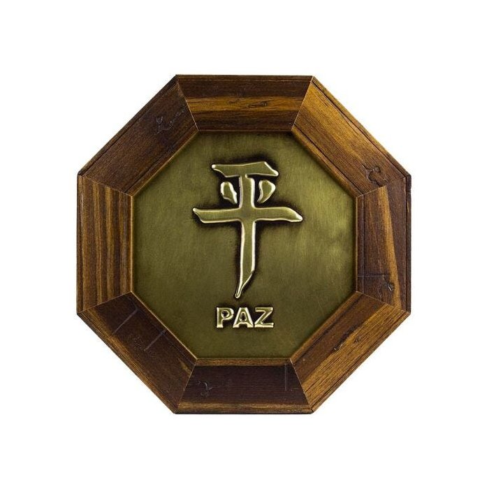 Ideograma Japonês Paz. Quadro para harmonização de ambientes, Feng Shui e decoração. Dimensões: 18,5 x 18,5 x 1 cm (Comprimento x Largura x Altura). Peso: 120 gramas. Material: Quadro octagonal em madeira, metal e espelho no centro. *Dimensões e peso aproximados.
