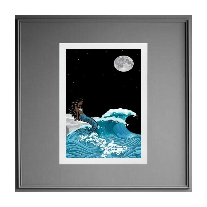 Quadro Iemanjá Sereia Ao Luar 33x24cm - com Vidro:madeira Branca