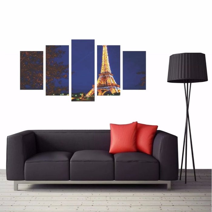 Quadro Impresso Torre Eiffel Paris Noite 160x80 5 Peças