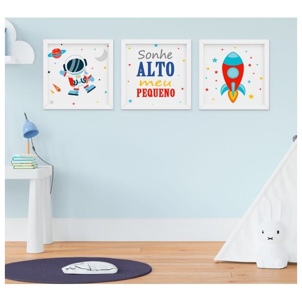 Quadro Infantil Bebê Menino Astronauta Foguete Sonhe Alto Kit 3 Peças Quadro Infantil Astronauta traz uma composição alegre e colorida. Os quadrinhos podem ser mesclados com outros objetos decorativos proporcionando um ambiente lúdico e divertido para seu pequeno.